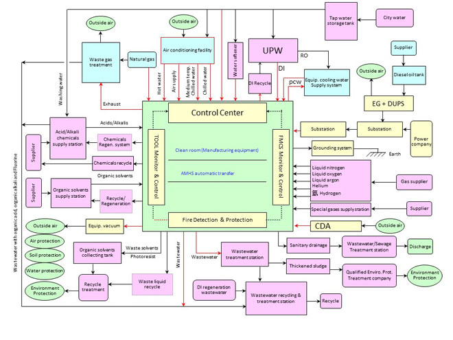 為滿足生產(chǎn)要求,高科技工廠的潔凈室設(shè)計(jì)了機(jī)電框架,不僅考慮到制造機(jī)器和自動(dòng)化生產(chǎn)和運(yùn)輸系統(tǒng),還考慮到高潔凈度空調(diào)控制系統(tǒng),防靜電裝飾,本地認(rèn)證和 UL(保險(xiǎn)商實(shí)驗(yàn)室公司)的防火系統(tǒng)。其他系統(tǒng)包括用于制造、真空、化學(xué)品供應(yīng)、特殊氣體供應(yīng)和 FMCS(工廠監(jiān)控系統(tǒng))的電力、純水、工藝?yán)鋮s水和干燥的無油壓縮空氣。當(dāng)這些系統(tǒng)協(xié)同工作時(shí),它們可以控制潔凈室中的灰塵顆粒、溫度和濕度。潔凈室所需的支持系統(tǒng)如圖 所示。