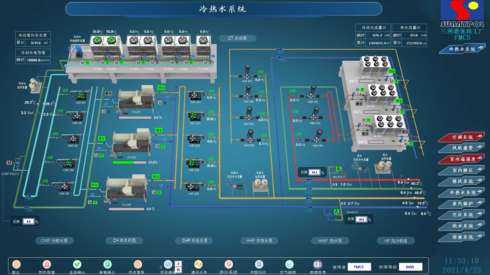 3、實(shí)現(xiàn)動(dòng)力站一鍵啟停功能:在中控室畫面上點(diǎn)擊一鍵啟停按鈕,實(shí)現(xiàn)水閥、水泵、冰機(jī)的連鎖控制,高效控制,達(dá)到節(jié)能的目標(biāo)也降低了企業(yè)管理人員數(shù)量;